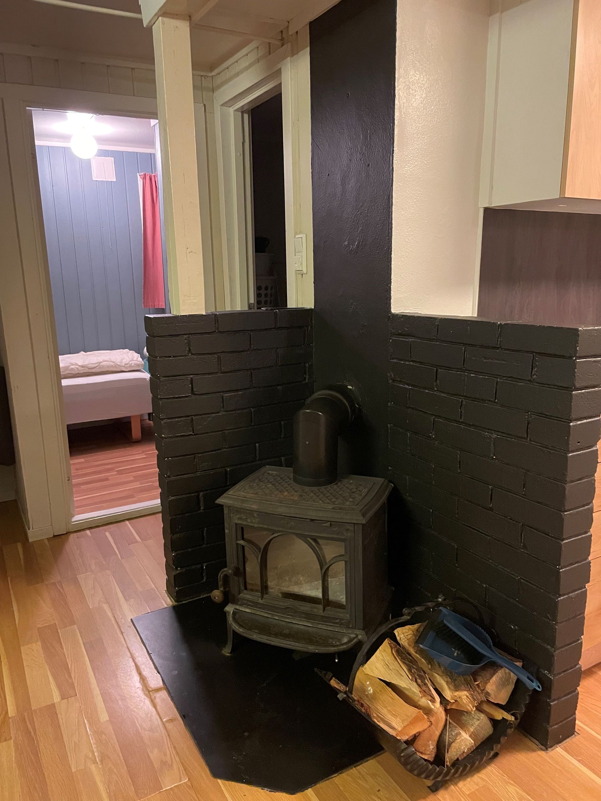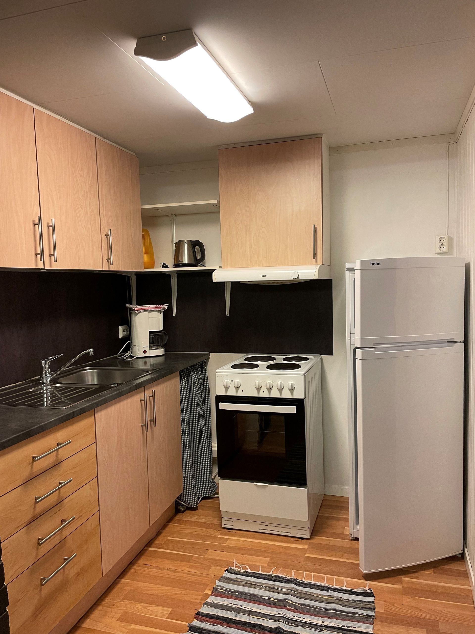 - Kjøkken med steikeplater og steikeovn, kjøleskap med ein liten frysar